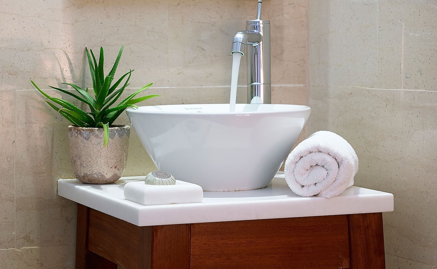 Marble lined bathroom with walk-in cabin shower or bathtub / separate WC with vanity unit
