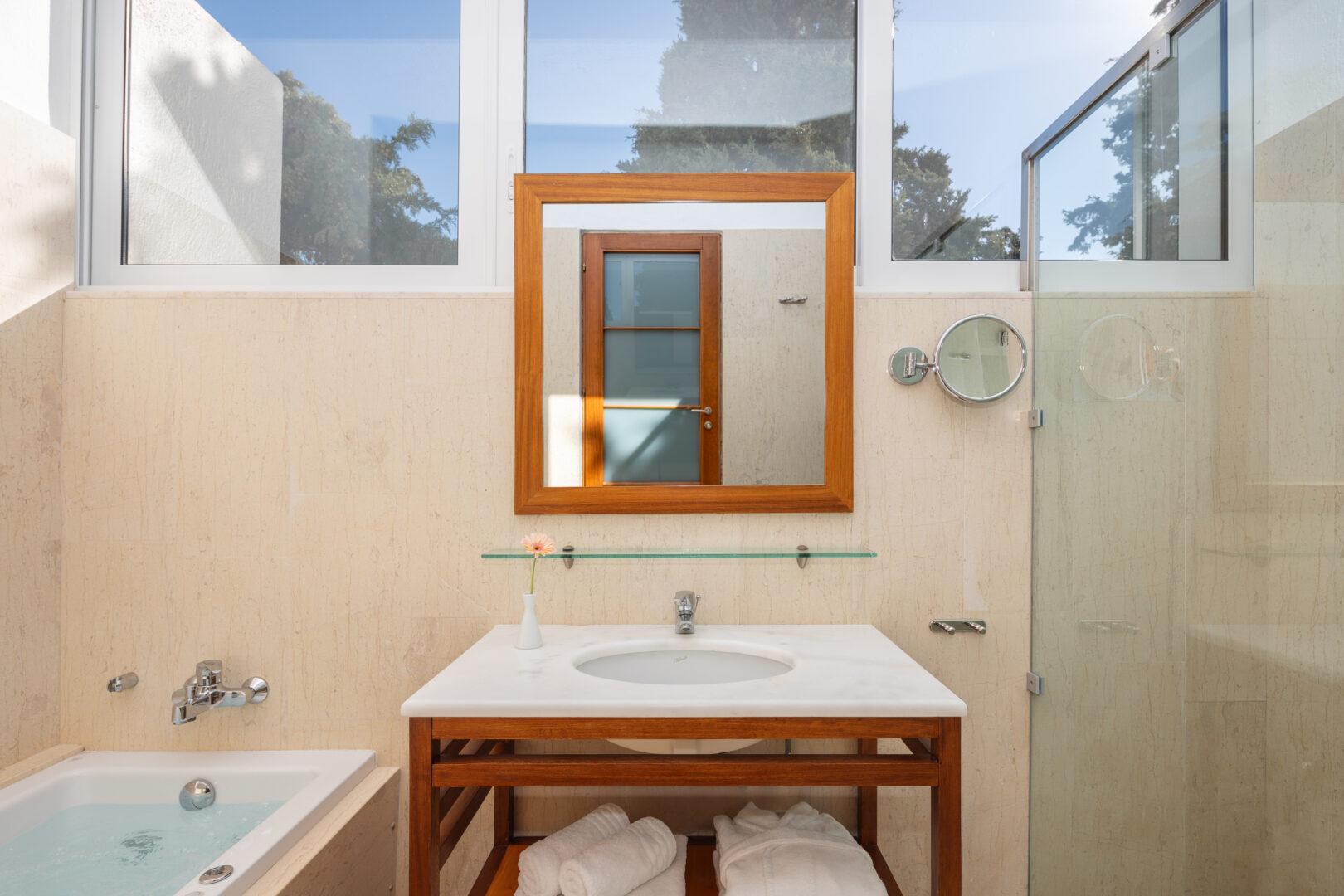 Marble lined bathroom with jacuzzi style bathtub / separate WC with vanity unit and walk-in shower