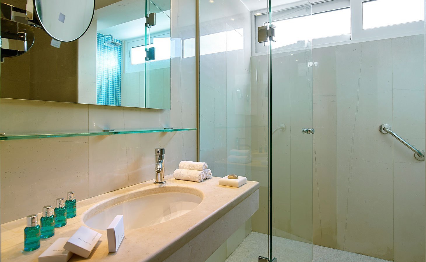 Complimentary bath products: makeup mirror / beach towels / bath towels / bathrobes / hairdryer / slippers / shower gel / shampoo / conditioner/ body lotion