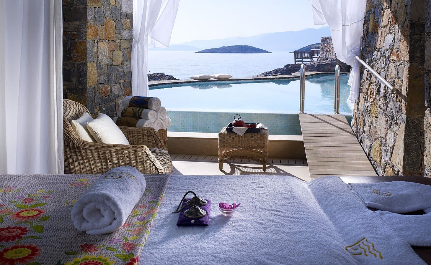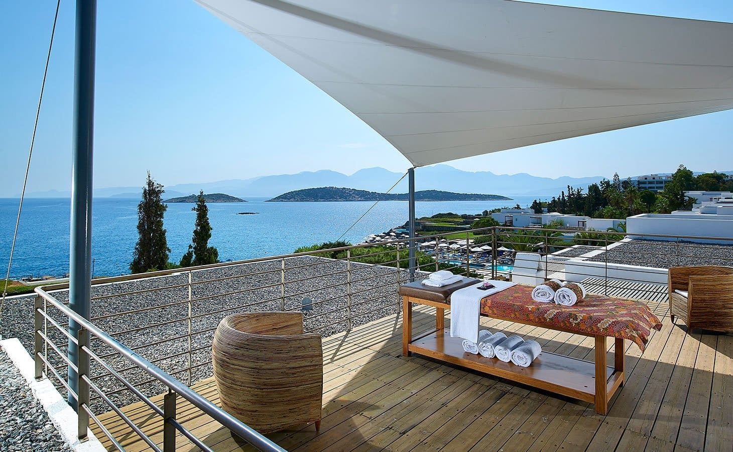 - The “Blue Room” and its private veranda overlooking the Mirabello Bay,
